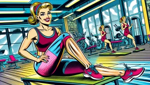 DALL·E 2024-02-16 17.47.06 – An American comic book style image of a woman doing leg slimming exercises with a bright smile on her face, positioned at the edge of the frame. The s