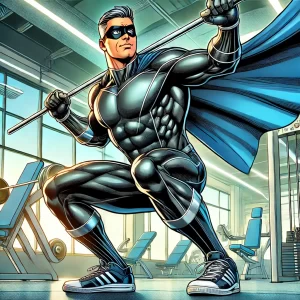 DALL·E 2025-03-24 12.04.07 – A comic book-style illustration of a middle-aged superhero wearing a sleek superhero suit and a mask, performing a squat exercise in a modern gym. The
